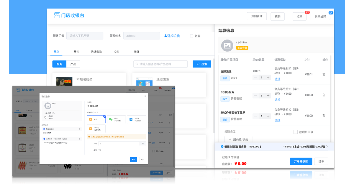 卡券、积分、余额、现金同步使用,轻松完成优惠、结算、收银