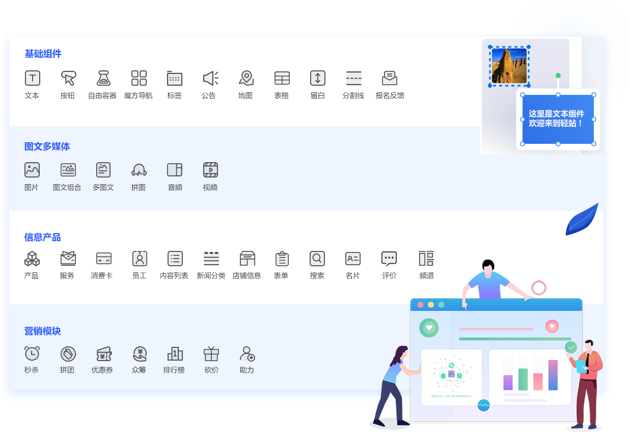 智慧轻站2.0集成四大类功能组件,共36个组件,在模板个性化设计时,无需代码知识,只需拖、拉、拽,即可完成个性化的模板设计