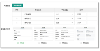 支持自由定义产品属性项、属性类型、及显示样式,支持多种样式展示模式。