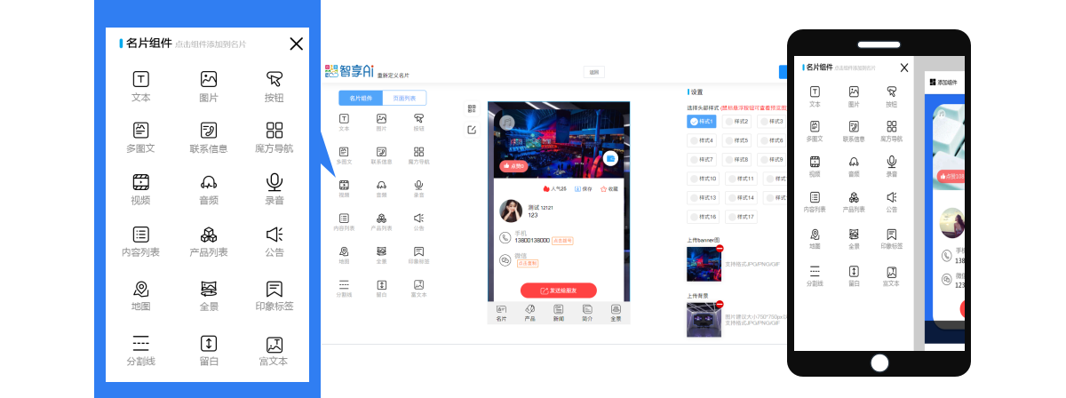 共有18个强大的功能组件让你快速装修DIY搭建自己的营销名片,同时支持PC电脑WEB端、H5移动端+小程序端