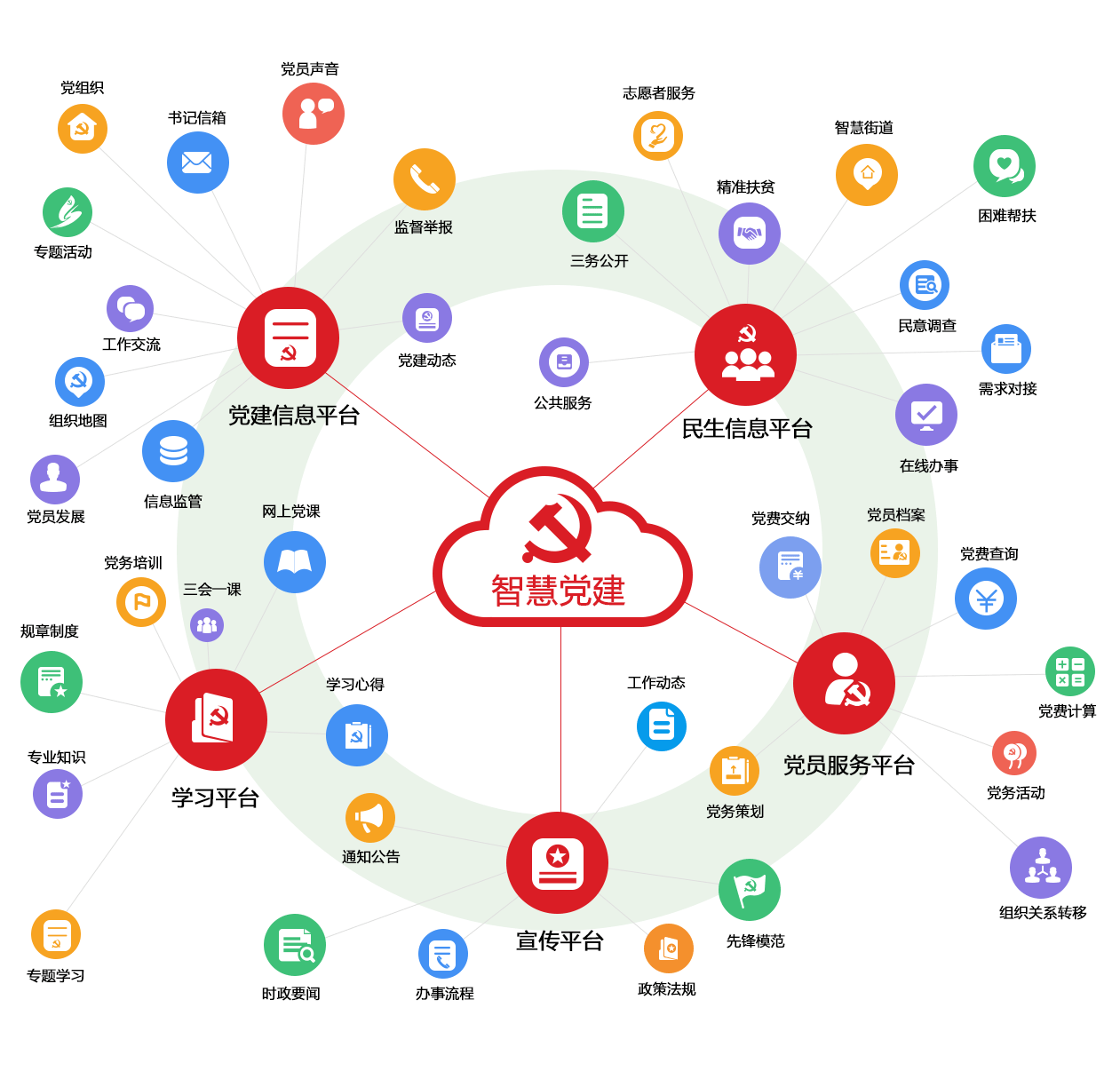 智慧的党建力求全面覆盖党建所有业务,打造宣传、教育、民生、服务、监督一体化平台。 智慧党建解决方案主要五大平台: 以快速高效的互联网技术来推进党建平台的建设,把党务干部、党员、群众3类不同人群通过智慧党建系统联合起来,其中五大平台模块有:党建资讯平台、民生平台、党员学习平台、宣传教育平台和党员服务平台,干部、党员、民众一体化的平台,实现掌上党建,随时随地参与组织生活、随时随地处理党务工作、随时随地学习考试、随时随地交流互动、随时随地参与民主评议。了解“智慧党建”系统功能,请访问“智慧党建”专题页:https://www.165183.com/theme_zhdj.html